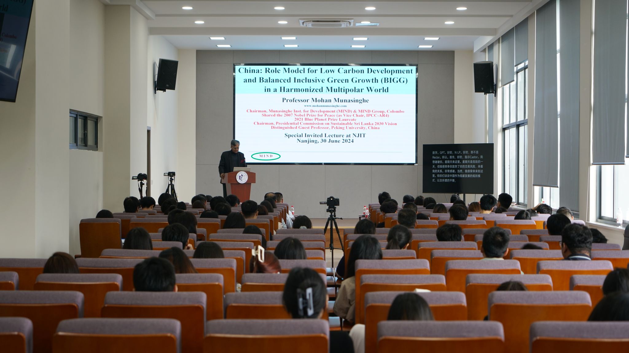 聘任仪式后,MUNASINGHE教授带来了“Balanced inclusive green growth (BIGG) and low carbon development in a multipolar world - Key role of China”的学术报告。他分析了全球可持续发展的阻碍因素,指出了全球气候变化的严峻趋势,并基于他创设的可持续发展三角框架和平衡包容性增长(BIGG)模型,为世界各国的可持续发展指明了方向。他认为,中国将在全球包容性绿色增长与低碳发展中起关键作用,表达了对中国经济、社会发展和责任管理可持续发展教育的积极预期。最后,MUNASINGHE教授还与现场师生就责任管理教育、绿色经济发展等议题进行了广泛的交流与互动。