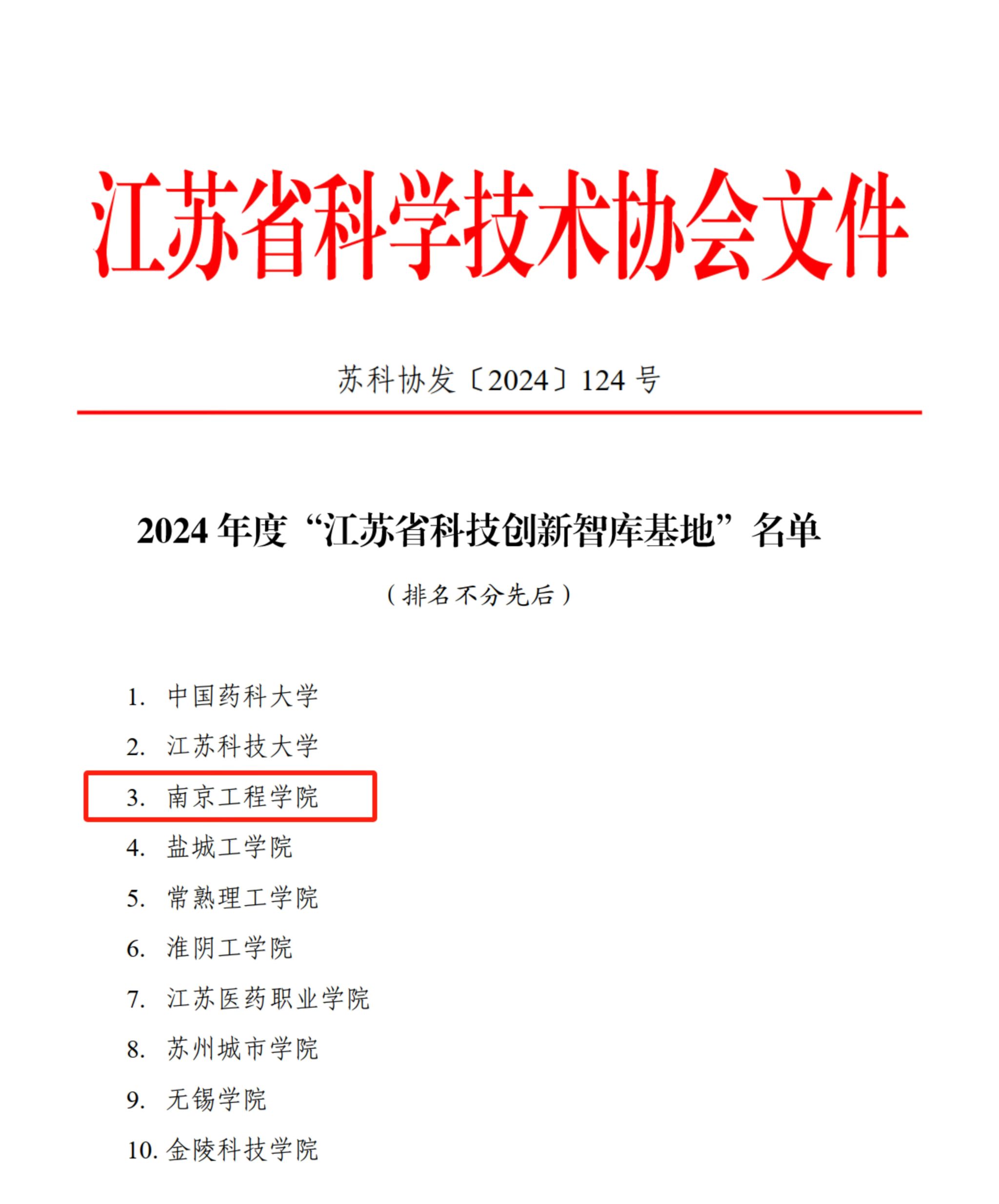 近日,江苏省科协发布《2024年度“江苏省科技智库计划(基地)项目”立项的通知》(苏科协发〔2024〕124号),认定永利官网为2024年“江苏省科技创新智库基地”,这是继2021年永利官网首次获批以来再次获批这一省级智库基地。