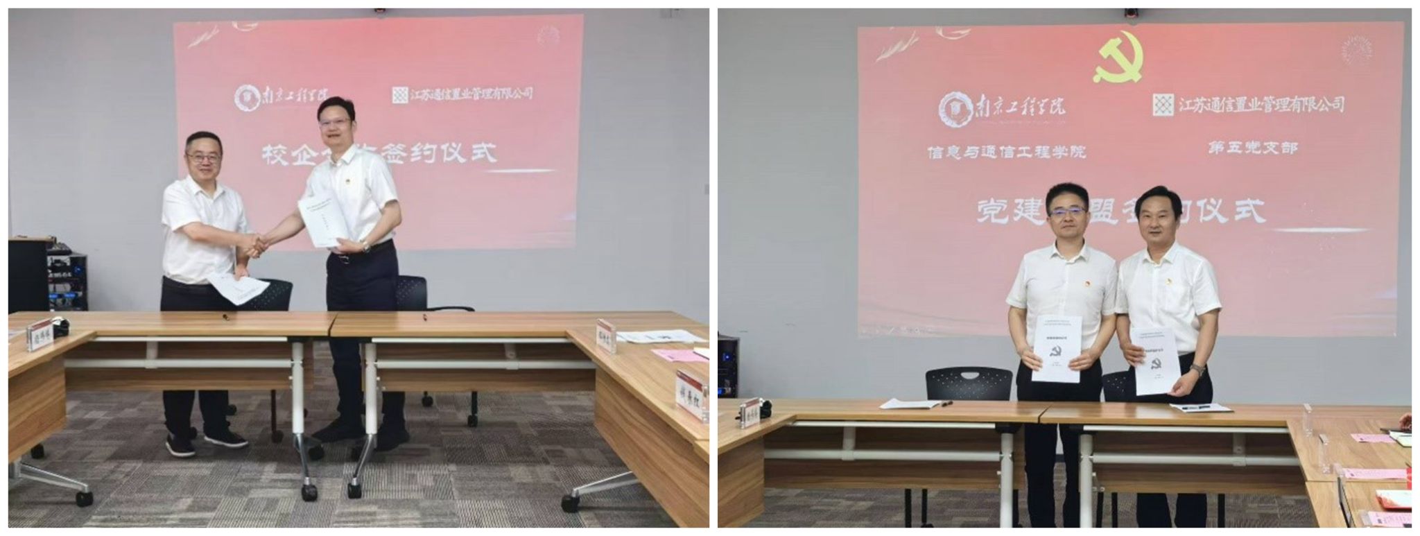 在江苏通信置业管理有限公司,党委书记、总经理沙仙虎热情接待了包永强一行,并详细介绍了公司的发展历程、业务领域及未来发展战略。包永强介绍了永利官网的办学特色、学科优势及人才培养成果,表达了加强校企合作、实现互利共赢的期待。会上双方签署了校企战略合作协议。永利官网信息与通信工程学院与公司签署校企党建共建协议,并举行实习实训基地揭牌仪式。
