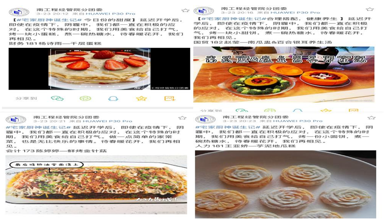 近期,经济与管理学院积极组织开展“学霸养成记”“我是厨神”“健康达人接力赛”系列活动,同学们在疫情期间一展青春风采,丰富居家生活,身体力行助力抗“疫”。