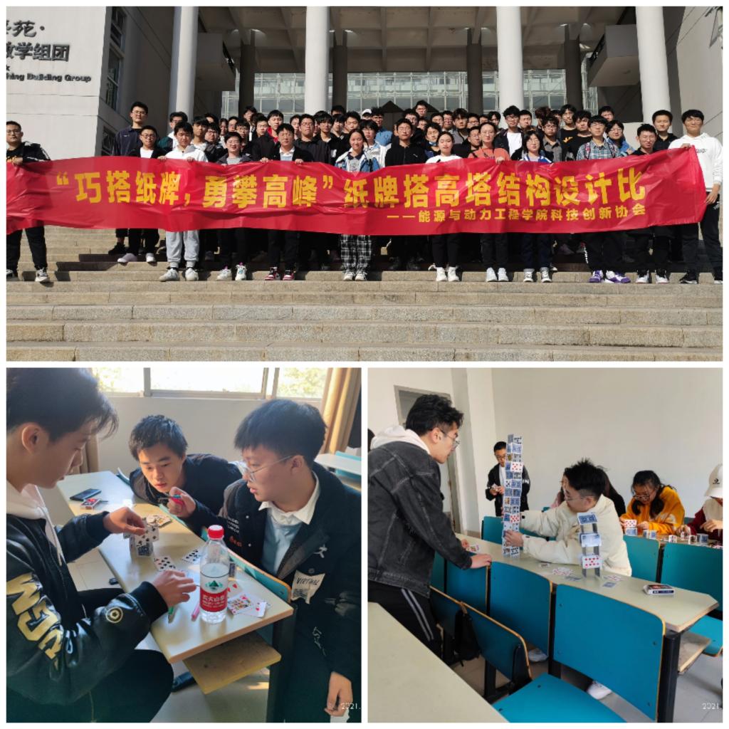 11月13日下午,能源与动力工程学院科技文化节之“纸牌搭高塔”结构设计比赛在学海苑·公共教学组团南馆紧张激烈地进行着,近200名同学参与了此次活动。比赛要求每位参赛选手在规定时间内以扑克牌为材料,采用“折、叠”两种方式进行搭高。